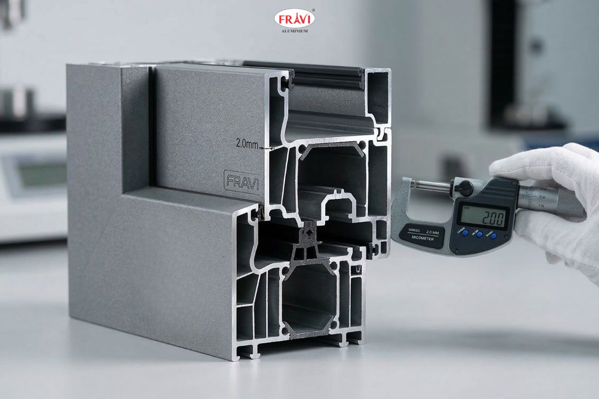 - Giải pháp: Hãy chọn thanh nhôm định hình có độ dày tiêu chuẩn từ 1.4mm đến 2.0mm cho các vị trí cửa chính và cửa sổ. Với hệ nhôm Fravi, cấu trúc khoang rỗng cùng độ dày đạt chuẩn sẽ đảm bảo độ cứng vững tuyệt đối cho công trình.