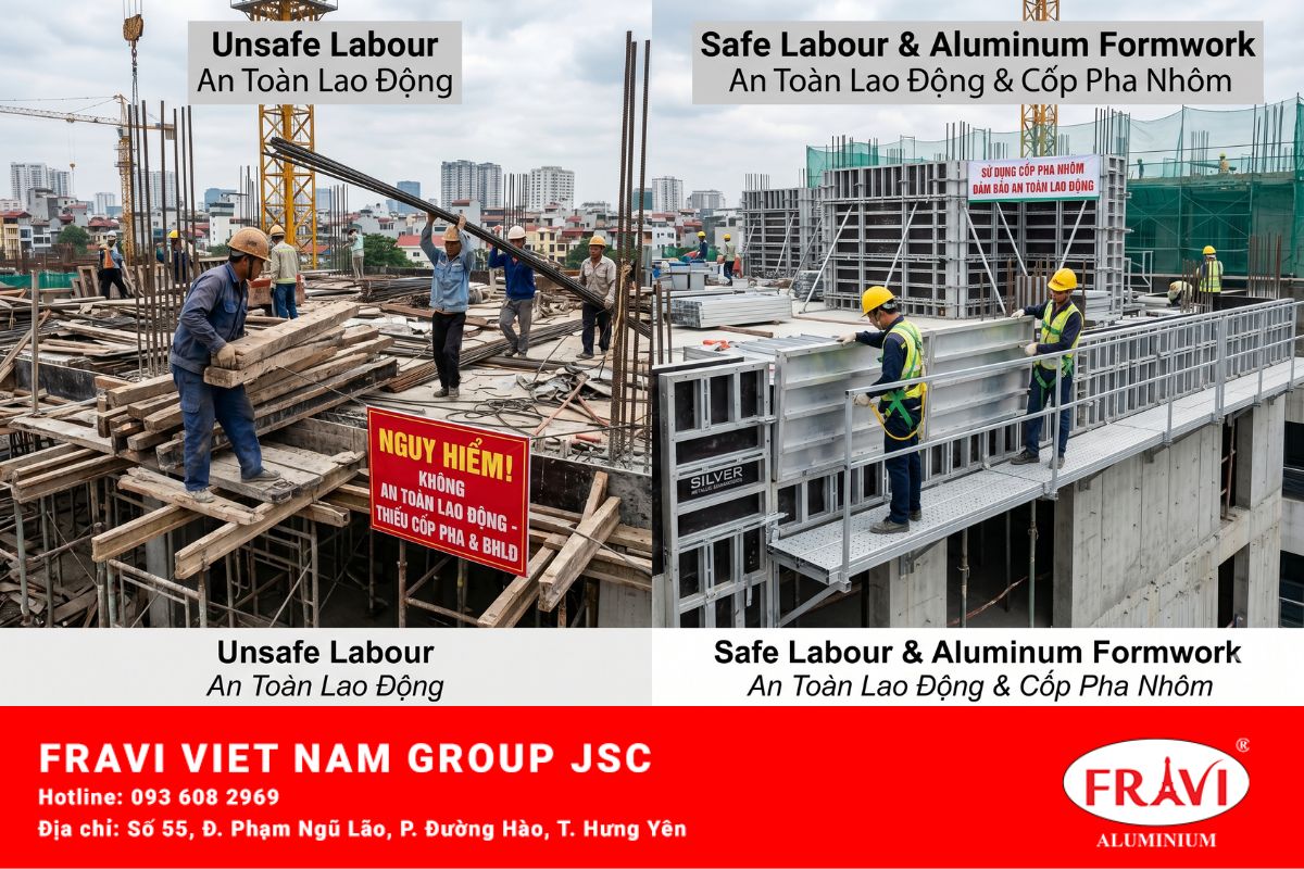 Hệ thanh giằng nâng đỡ cốp pha nhôm sàn giúp thi công nhanh chóng, giảm tiếng ồn và đảm bảo an toàn lao động, đồng thời hạn chế tối đa nhu cầu giàn giáo bao che truyền thống — vốn là một trong những nguồn tai nạn sập đổ nghiêm trọng nhất tại công trường Việt Nam.