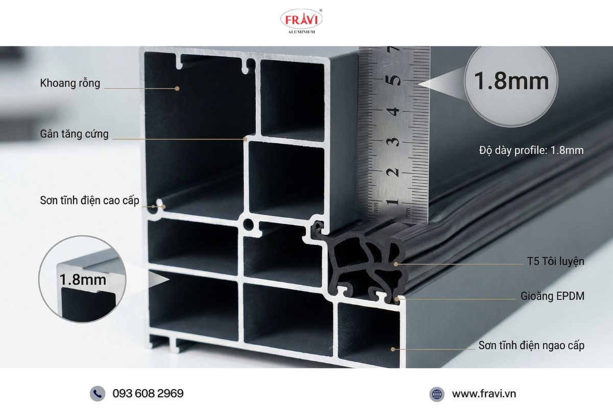 Cửa nhôm kính chuẩn không chỉ nằm ở vẻ ngoài mà còn ở cấu trúc bên trong. Các thanh profile nhôm Fravi được thiết kế với: