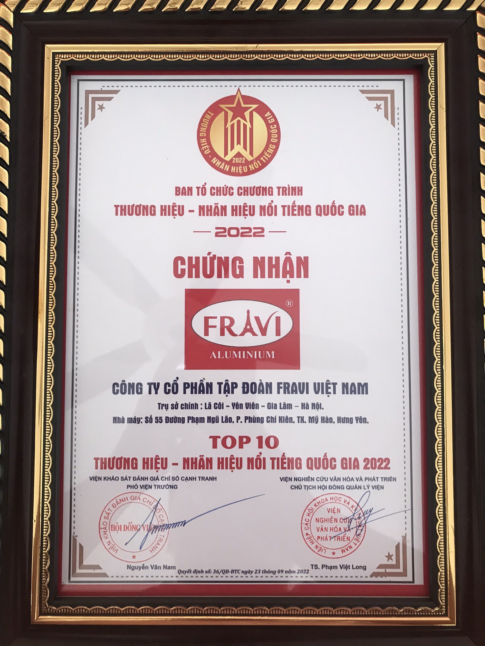 Việc Fravi Aluminium được vinh danh tại Lễ công bố Thương hiệu - Nhãn hiệu nổi tiếng Quốc Gia 2022 chính là kết quả sau bao cố gắng không mệt mỏi của toàn bộ cán bộ, công nhân viên của công ty trong suốt thời gian qua, là lời đánh giá khách quan nhất về chất lượng sản phẩm mà công ty mang đến tay người tiêu dùng!