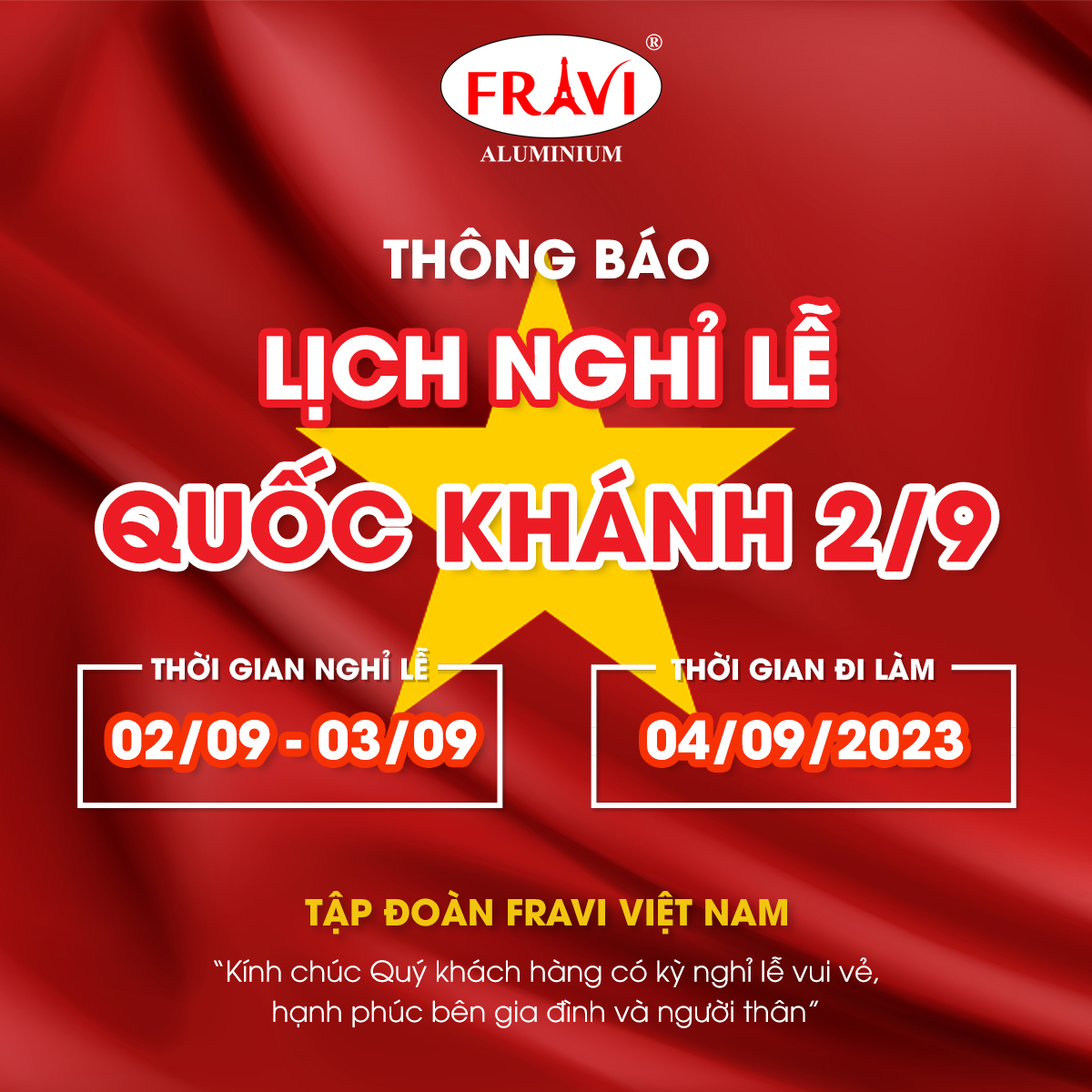 Kính gửi Quý khách hàng của tập đoàn FRAVI. Trong không khí tràn đầy tình yêu và lòng tự hào dành cho Tổ quốc, chúng tôi xin trân trọng thông báo về lịch nghỉ lễ Quốc Khánh - Ngày 02/09.