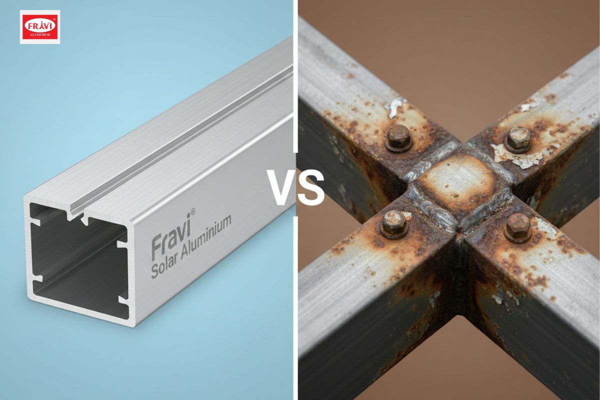 Trước đây, khung sắt hoặc thép mạ kẽm thường được ưu tiên vì giá rẻ. Tuy nhiên, trong môi trường điện mặt trời (vốn tiếp xúc trực tiếp với nắng mưa 24/7), nhôm định hình Fravi đã chứng minh ưu thế tuyệt đối: