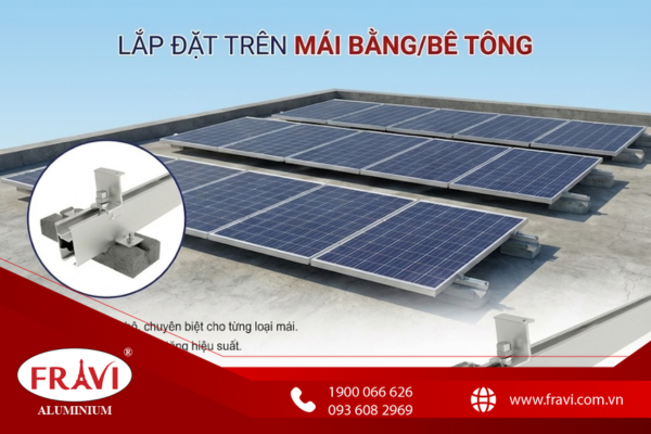 - Giải pháp FRAVI: Kết hợp rail nhôm với hệ thống chân đế bê tông đúc sẵn hoặc khung giàn nâng cao độ nghiêng.