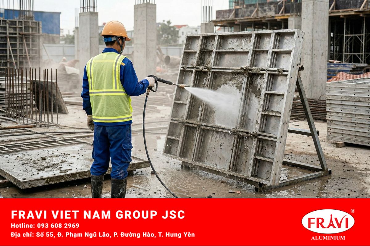 Thời điểm vàng để vệ sinh cốp pha nhôm là ngay sau khi tháo dỡ (stripping), khi các mảng bám bê tông còn chưa đóng rắn hoàn toàn.