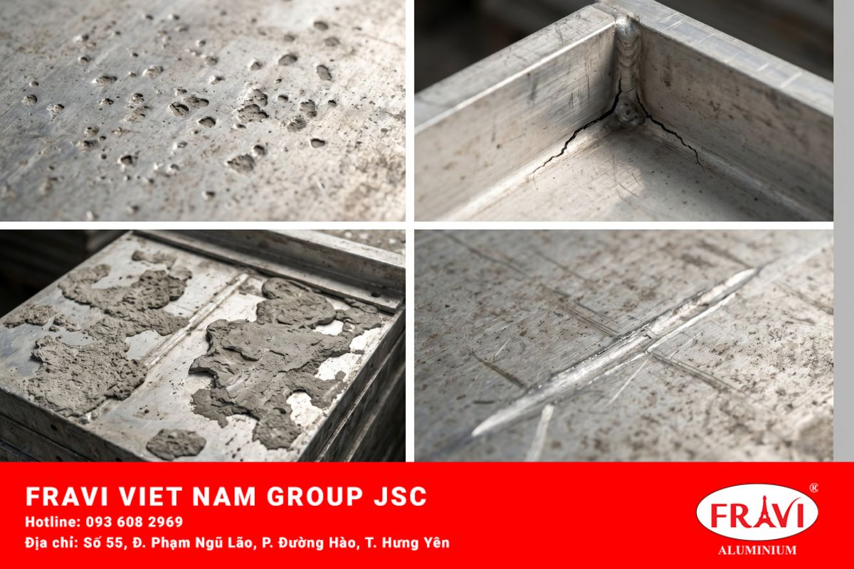 Cần nhận biết và xử lý các dạng hư hỏng sau. Ăn mòn dạng rỗ (pitting): chấp nhận nếu hố nông dưới 0,5mm, loại bỏ nếu hố sâu làm mất vật liệu đáng kể. Nứt mỏi tại các góc: vết nứt xuất phát từ lỗ chốt hoặc góc tấm là dấu hiệu nguy hiểm, cần loại bỏ ngay lập tức. Bã xi măng bám cứng: lớp bê tông cứng còn sót không chỉ làm mất độ phẳng mà còn là dấu hiệu bảo dưỡng kém từ phía đơn vị cho thuê. Vết trầy sâu: chấp nhận trầy bề mặt nhẹ, từ chối nếu trầy làm lộ lõi nhôm và có chiều sâu hơn 0,3mm kéo dài liên tục.