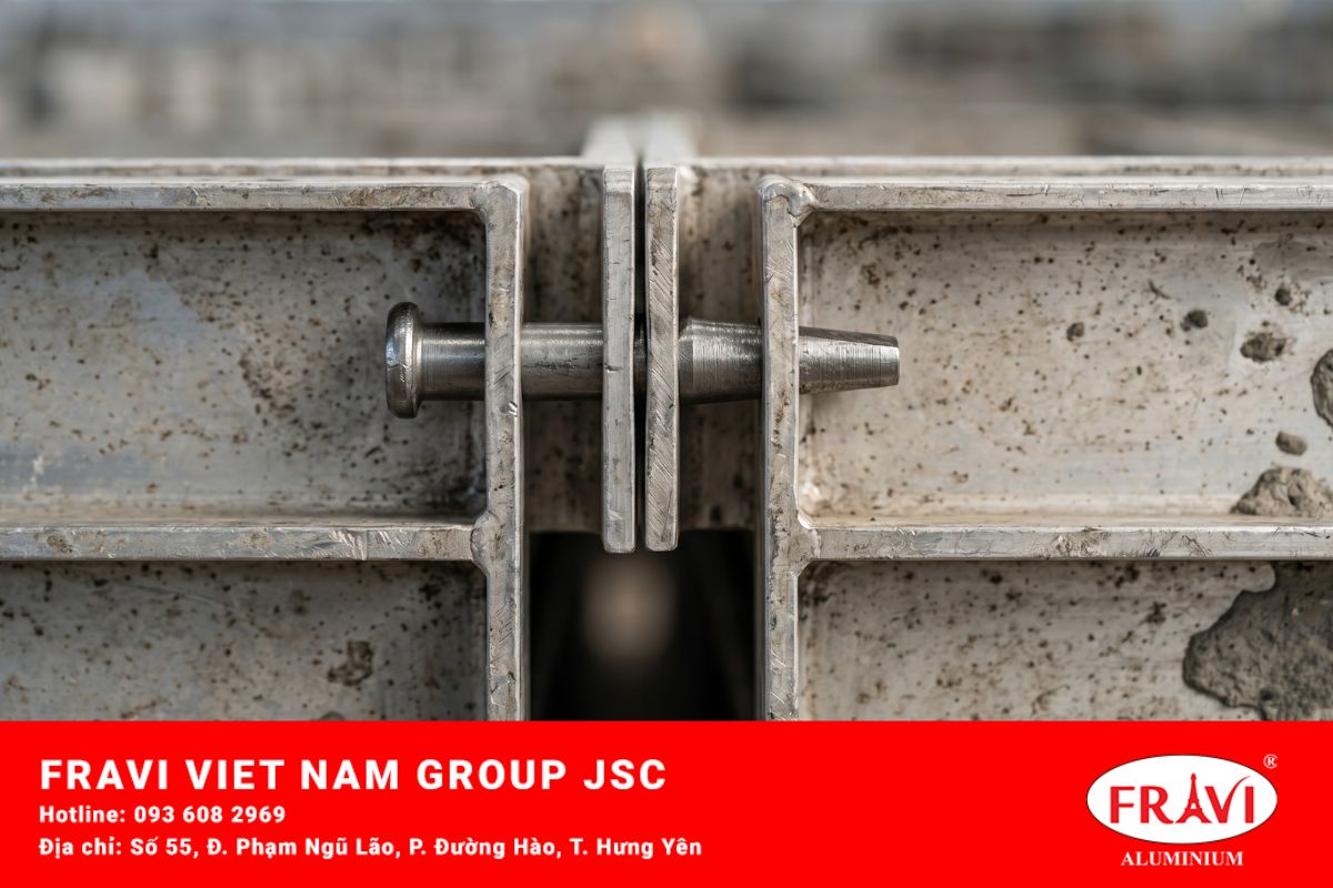 Hệ thống liên kết là "xương sống" của toàn bộ cốp pha nhôm. Một tấm khuôn tốt lắp với chốt pin bị mòn hoặc lỗ ghép bị rộng sẽ gây ra khe hở mối nối — nguồn gốc của tình trạng chảy sữa bê tông, lệch tim cấu kiện và tốn công trét kín sau đổ.