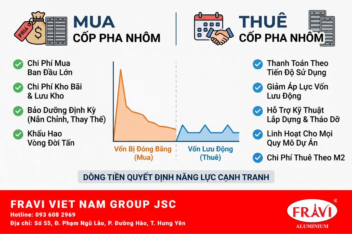 Sự thay đổi này không phải ngẫu nhiên. Nó phản ánh một thực tế mới trên thị trường xây dựng Việt Nam: áp lực về dòng tiền ngày càng lớn, chu kỳ dự án ngày càng ngắn và yêu cầu chất lượng bề mặt bê tông ngày càng cao. Trong bối cảnh đó, sở hữu cốp pha nhôm không còn tự động là lựa chọn tối ưu.