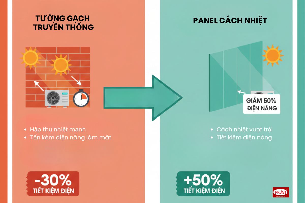 Các dòng Panel tại Fravi được nghiên cứu để tối ưu hóa khả năng ngăn nhiệt từ bên ngoài và giữ nhiệt bên trong. Điều này cực kỳ quan trọng đối với khí hậu nhiệt đới gió mùa của Việt Nam. Việc sử dụng Panel giúp giảm tới 50% nhu cầu sử dụng điều hòa nhiệt độ – nguồn tiêu thụ điện chính trong các tòa nhà.
